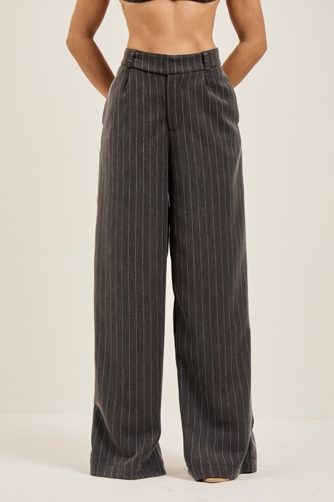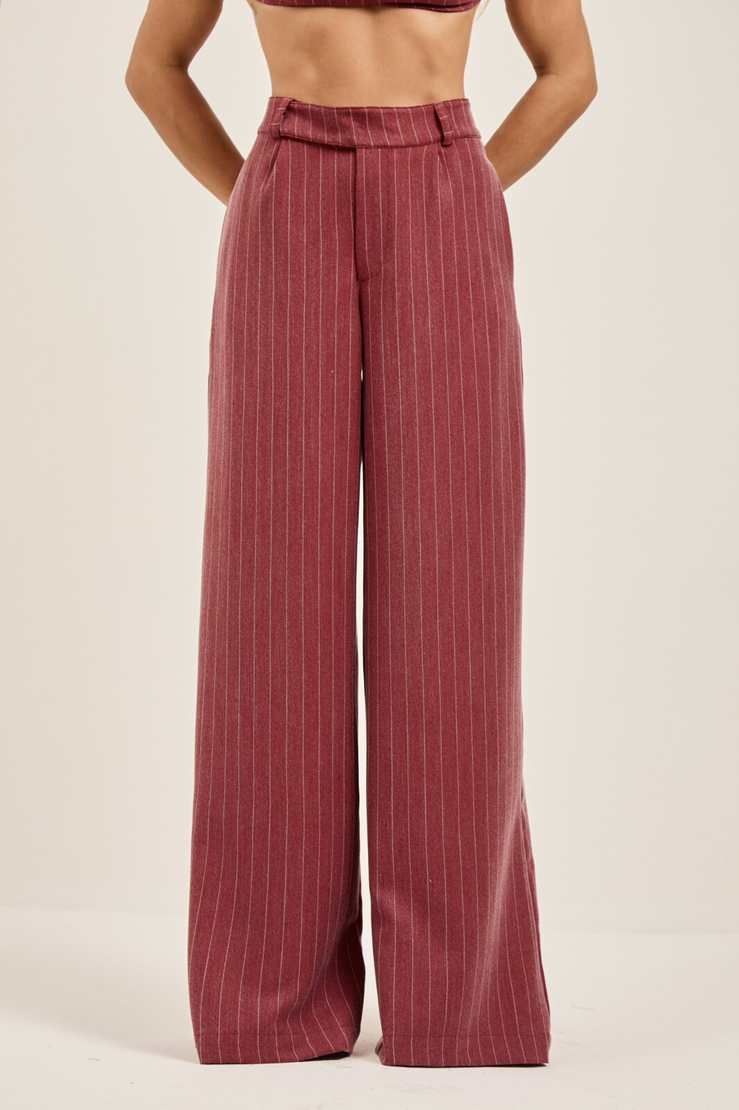 Conjunto Top e Calça risca de giz com calça reta em alfaiataria, com pregas e bolsos laterais. Top com regulagem na alça e regulagem na parte de trás para ajustar ao corpo, forrado.